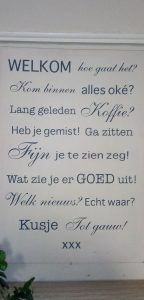 Het gesprek vindt plaats in de veranda, met zicht op de, door Julienne onderhouden, prachtige tuin. Het feestvarken mag voor de foto plaatsnemen vóór één van haar eigen kunstwerkjes met klei, gemaakt in de hobbyclub. Vooraleer ik haar woning verlaat, moet ik nog even een blik werpen op het gedicht dat in de keuken hangt. Enkele woorden die de gastvrijheid bij Julienne volledig typeren !